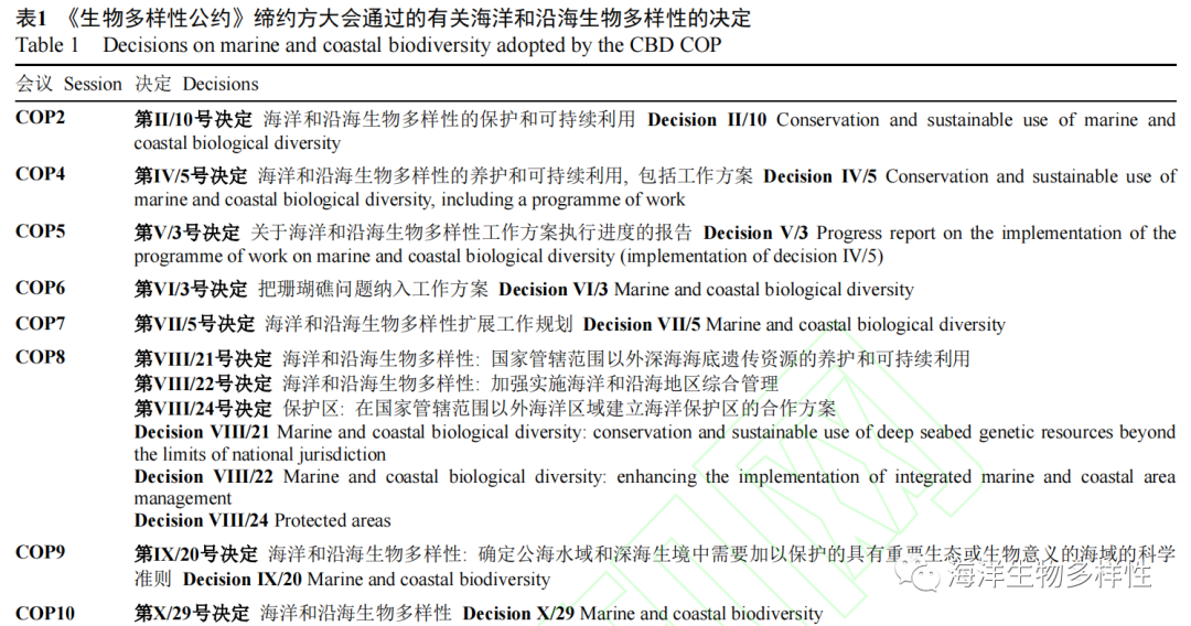 Conference of the Parties, COP)相关议题, 分析了海洋生物多样性保护的发展历程, 以科学文献以及《生物多样性和生态系统服务全球评估报告》(以下6 o) z& S$ v" y. y