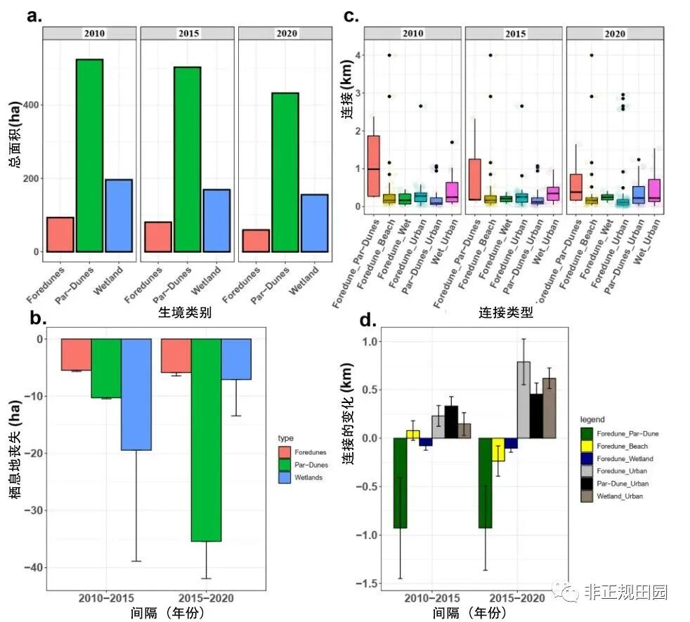 (3)连接类型随时间的变化 2010年至2020年,前沙丘与其他自然海岸栖息地的总连接减少了2.6km,与城市基础设施(NAT-URB)的连接增加了13.53km(图5c)。在2010-2015、2015-2020两个时间间隔内,前沙丘与平行沙丘的连接显著减少(图5d,表S2)。