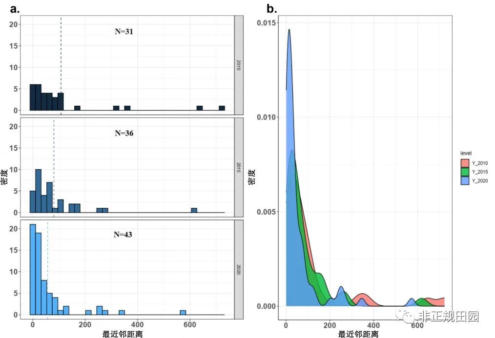 $ N2 S9 n, q! w- I 2010年至2020年,前沙丘斑块数量有所增加,但前沙丘斑块的结构变化较小,这表明前沙丘空间碎片化严重(图4)。