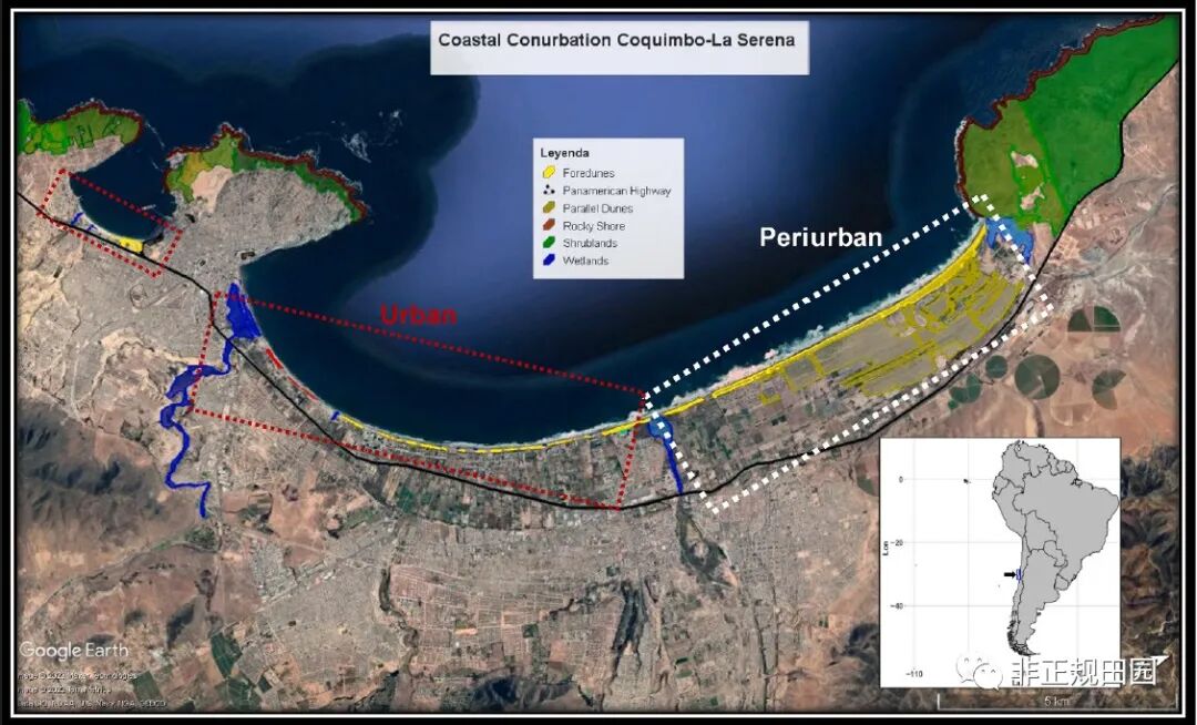 在过去的几十年里,科金博和拉塞雷娜分别经历了从独立的港口和旅游城市到合并为一个城市。城市中的湿地(河口、溪流)几乎完全被建成的基础设施包围。 图 1:研究总城市研究景观图黄色带状区域:城市和近郊地带中的前沙丘斑块;红色点矩形:城市区域;白色虚线矩形:城市周边地带