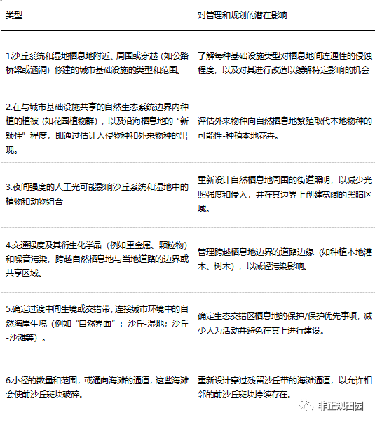 沿海前沙丘经历了持续但不等同的程度下降,并与其他沿海残余生态系统的结构连通性显著降低。 (1)城市化导致的沿海前沙丘损失和破碎是一种长期和短期的世界性现象,由多种人为和自然机制协同驱动;(2)许多沙丘系统被“封装”在城市地区,但仍充当城市环境中物种连接的走廊,在容纳生物多样性方面仍具有重要作用;(3)改进沿海城市规划及剩余栖息地管理措施,以便更有效的在城市扩张时期对前沙丘和剩余栖息地进行保护和恢复(见表1)。
