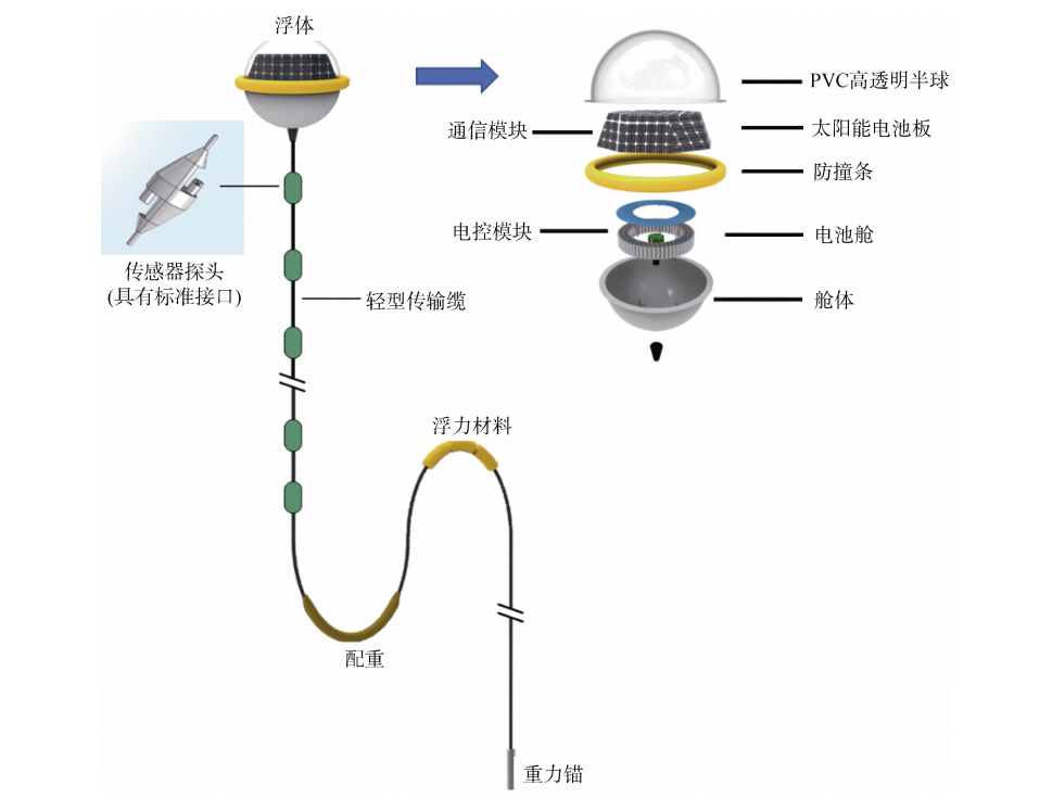 " }$ g: y2 H9 w0 ^9 e 目前国内外漂流浮标大都仅关注表层温度、流速参数的测量,工作模式单一,仍然存在高精度传感器价格昂贵、依赖进口的状况,单温测量要素的浮子售价在万元左右,多水文气象要素的漂流浮标的造价将增加到4万元以上,甚至达到20万元,这成为阻碍浮标大规模布放应用的重要问题。那么,未来海洋牧场物联网小浮子是借鉴传统表面漂流浮标的结构特点,优化其电源、智能通信与控制以及传感器链挂接结构、接口,可搭载传感器链在海洋环境下长期运行。同时采用环境友好型材料,并将成本控制在人民币5000元左右,作为一种面向海洋物联网的新型通用小浮子观测平台,如图4所示。