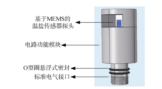 + z% _- L& J6 @- Y: M+ c/ O) r 图5基于MEMS技术的低成本温盐传感器探头结构和封装节点结构