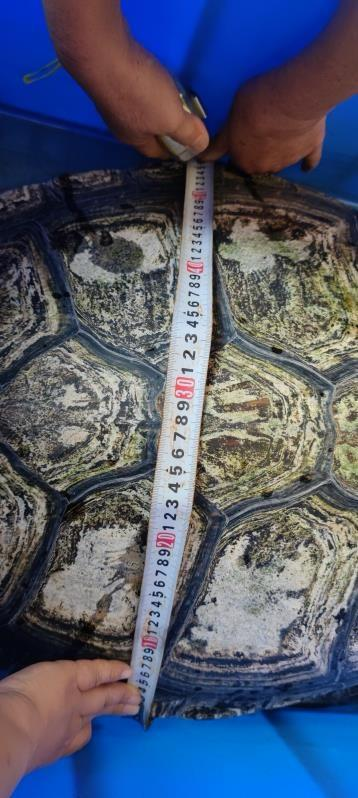 经仔细观察辨认,救护人员初步判定该野生动物属于水生大型海洋龟类,重25公斤,外表体征状态良好。海龟的龟壳尺寸超过半米,达到55厘米,体型庞大。