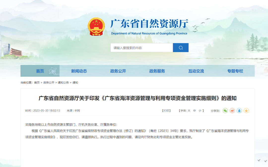 近日,为加强广东省海洋资源管理与利用专项资金管理,提高资金使用效益,根据《中华人民共和国预算法》等规定,结合广东省实际,广东省自然资源厅印发《广东省海洋资源管理与利用专项资金管理实施细则》的通知。