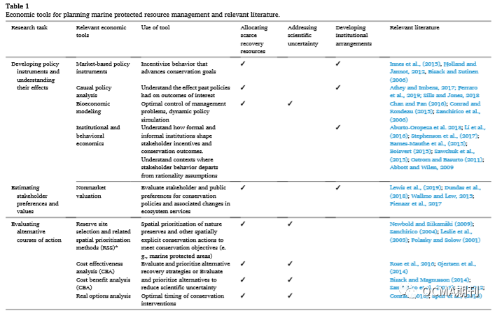 9 m" z0 n' B. X# k6 \+ R5 E) Y 表一:海洋保护资源管理规划的经济工具及相关文献