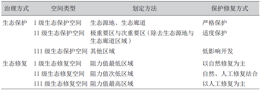 D6 g, u$ S' C! |5 k0 g% c1 Z& F 表1 生态保护修复空间划分方法及保护修复方式
