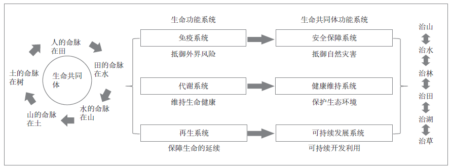 生命共同体理念从本质上揭示了山、水、林、田、湖、草各生态要素是相互作用形成的特定结构与生态系统功能的有机整体。该理念的核心在于通过生态功能的耦合机制实现生命共同体不同组成要素的衔接,保障生命共同体不同生态功能的正常发挥。