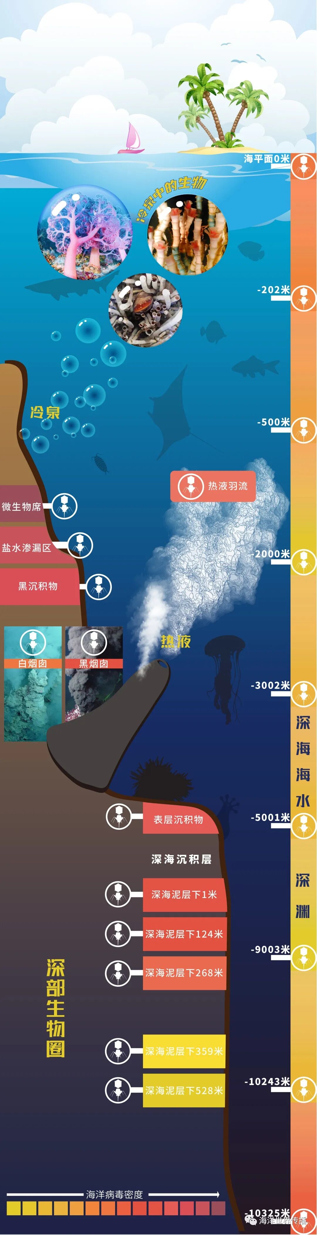 深海作为海洋环境的一部分,其与上层海洋及下部的深部生物圈之间有着广泛的物质能量交流,三者共同构成了海洋乃至全球生态系统的有机整体。研究表明,超过30%的上层海洋病毒会被吸附到有机和无机颗粒上,进而沉降到深海。由此看来,病毒在不同海洋层位中的异同和关联,尤其是在深浅海之间物质、能量及信息流中的作用也值得特别关注。