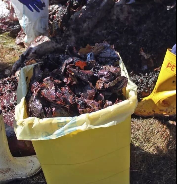 困在浮油里的褐鹈鹕。 ( k, C- _0 D; l. Q$ j6 `6 ]2 n