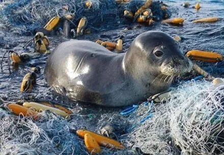 被困在巨大的废弃渔网中的海豹。 5 H9 C& Y/ I, X) W6 {8 D1 y