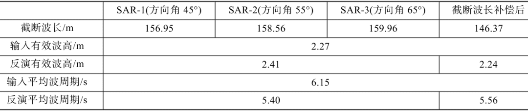 单星SAR观测海浪存在方位向波长截断的现象,使得SAR无法观测到完整的海浪信息,海浪信息提取的精度受限。项目使用SAR成像仿真技术模拟了多星多视向SAR海浪同步观测数据,建立了SAR观测海浪截断波长的补偿方法。该方法提出采用卫星协同组网信息互补的方式来解决单星SAR观测海浪的固有问题。以方向角为45°、55°、65°的三星组网补偿结果为例,截断波长补偿前后反演的海浪参数和准确值的对比如表2所示。补偿前反演有效波高的偏差是0.14m,补偿后反演有效波高的偏差是0.03m;补偿前反演平均波周期的偏差是0.75s,补偿后反演平均波周期的偏差是0.59s;提高了海浪参数的反演精度。 2 N" \& T- ^1 f: }: F0 [