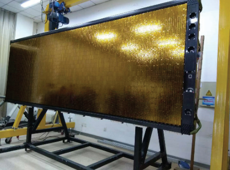 为解决小卫星SAR组网中的SAR载荷轻量化、载荷多功能一体化等“卡脖子”技术问题,项目突破了二维轻质化相控阵天线技术(将天线重量密度由40kg/m2降至20kg/m2),完成了多模式小卫星SAR样机研制,可实现SAR、散射计、波谱仪和高度计4种工作模式,以满足对海洋目标和海洋动力环境的高精度同时测量,图2为所研制小卫星SAR二维相控阵天线的照片。 ' _( F9 \ B1 D! B& i