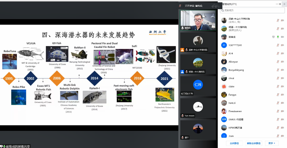 崔维成教授同与会师生进行交流讨论 人物介绍:崔维成,教授,博导,现任西湖大学讲席教授。我国“蛟龙”号载人潜水器总体与集成项目负责人,第一副总设计师,全程参与了项目管理和技术攻关。他是我国“百千万人才工程”一二层次首批人选(1996),国家重大人才工程特聘教授(首批,1999)。江苏省“333高层次人才培养工程”中青年科技领军人才(2007)、“全国优秀科技工作者”(2010)。2013年5月17日作为“蛟龙”号研制和海试团队的代表受到党和国家最高领导人的接见,并在随后的表彰大会上获颁“载人深潜英雄”勋章和证书。2016年被《自然》杂志评为“中国十大科学之星”。从2013年至2020年发起推动了“彩虹鱼挑战深渊极限”项目。现正在西湖大学开展第三代仿生智能机器鱼型潜水器的研制和针对大型复杂工程系统的基础理论研究。