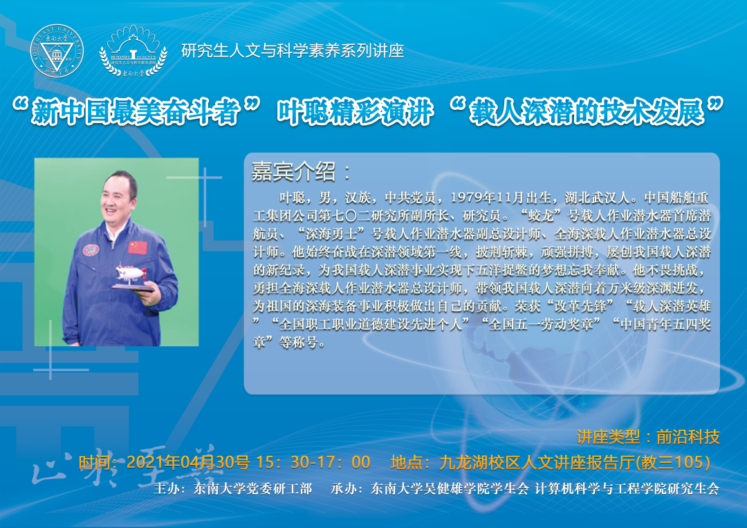 【讲座主题】“新中国最美奋斗者”叶聪精彩演讲“载人深潜的技术发展”