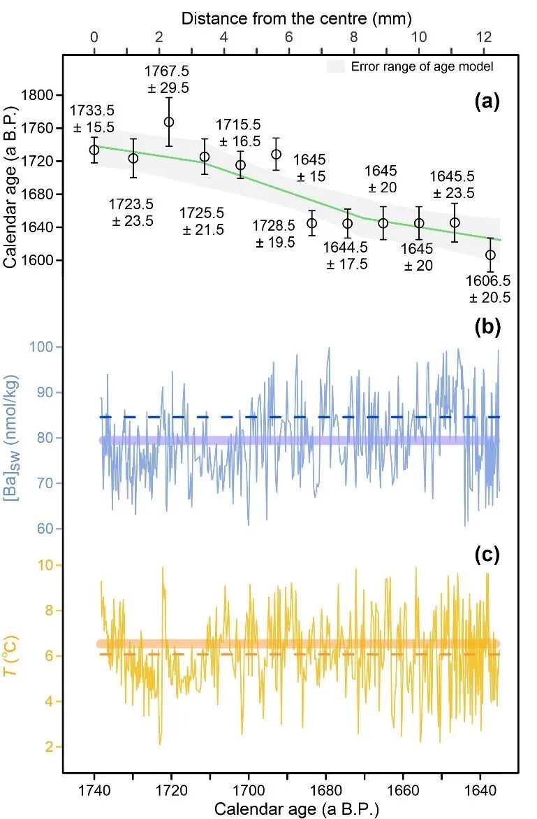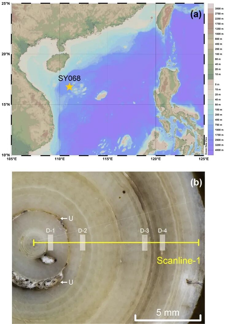 * ~3 l* A- {$ L  近年来,“深海勇士号”等深潜设备的科学应用取得了诸多成果,其中在南海发现了分布广泛、以竹节柳珊瑚为代表的冷水珊瑚林,填补了前有认识的空缺。竹节柳珊瑚,以其较长的生命周期和树轮状的同心圆生长纹层,被认为是记录中-深层海洋季节到十年际变化的良好载体(图1)。该研究旨在探索利用冷水珊瑚重建海洋内部环境变化的可行性与适用性。该文以南海西北部采集到的竹节柳珊瑚SY068-7-2的碳酸钙质骨骼为研究材料(图1),运用激光共聚焦拍照识别生长纹层、14C测年方法建立时间标尺、激光剥蚀等离子质谱分析元素含量,检验冷水竹节珊瑚古海洋学应用的方法。骨骼横截面可见显著的同心圆环生长纹层,利用激光共聚焦拍照结果可清晰识别。沿骨骼横截面径向的14C测年结果序列可以很好地识别珊瑚的生命长度及生长速率的相对变化(图2),但为珊瑚建立明确的年龄模式,首先需要更准确地了解南海中-深层海水14C储库年龄的分布及其历史变化。 图1 (a) SY068潜点位置;(b) SY068-7-2骨骼横截面。黄色线段标识出LA-ICP-MS扫描测线位置,U、D为直观可见的生长间断层 图2 竹节珊瑚SY068-7-2的古环境指标重建结果。(a) 据14C测年换算的日历年龄结果(圆圈,碳储库年龄设为990年)及其贝叶斯拟合年龄模式(绿色拟合线,灰色阴影示误差范围);(b, c) 骨骼Ba/Ca、Mg/Ca-换算的[Ba]sw和温度重建结果Mg/Ca、Ba/Ca等元素比值,被认为可用于竹节珊瑚骨骼的古海洋学重建(图2),然而本研究发现这些指标在南海的应用还需进一步优化;同时SY068-7-2的元素比值变化显示由年循环周期主导的特征,也与开放太平洋竹节珊瑚记录的与ENSO相关的多年际变化存在差异。该研究在提供初步检验结果的同时,也映射出南海冷水珊瑚古海洋学研究的未来方向,包括量化竹节珊瑚骨骼的钙化机制及其对地球化学指标的影响、检验并建立适用于南海和西太平洋的指标换算式等。