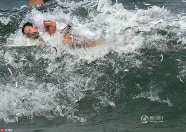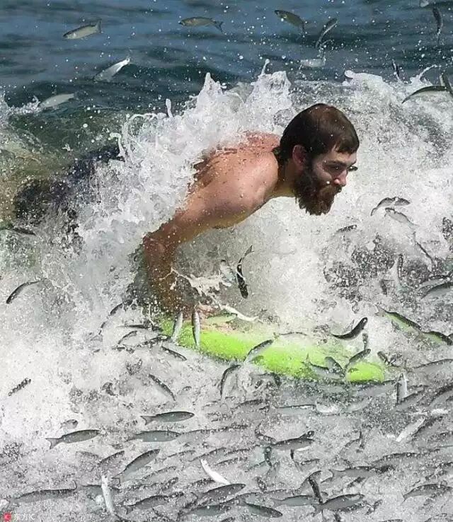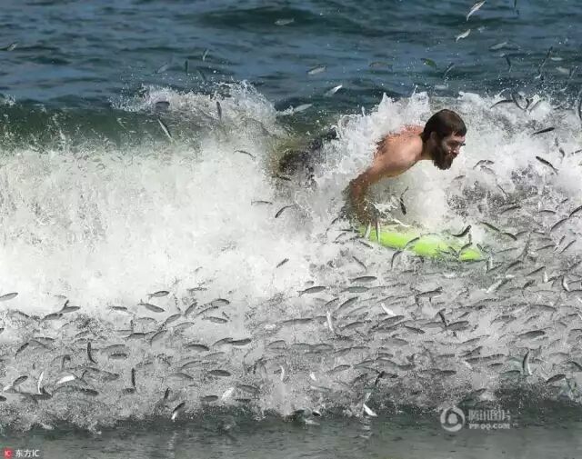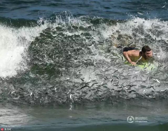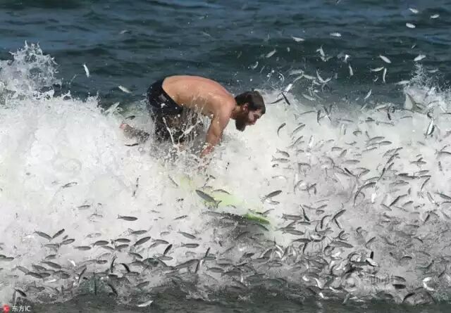 ' d# F+ m) V$ X 当地时间2016年9月9日,美国伯克莱屯,一男子冲浪遭遇鲻鱼迁徙,深陷“鱼群漩涡”,水花四溅场面搞笑。东方IC , i/ V( A; N% u5 s9 q
