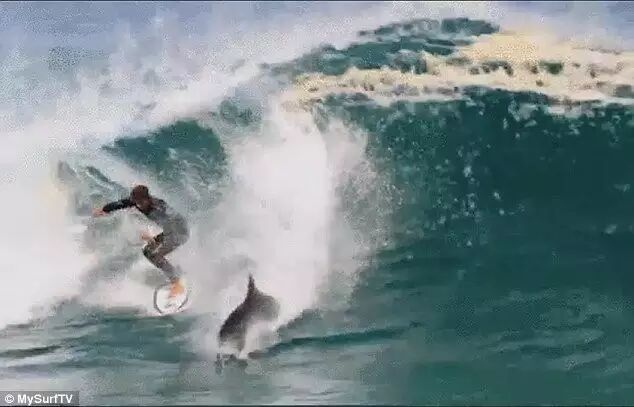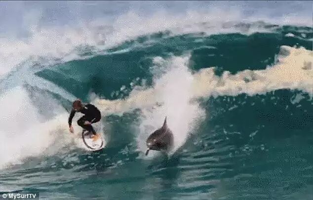 8 h4 l7 ?4 ]1 H3 y' o 冲浪时遇上一只海豚,怎么听都是浪漫的事儿。