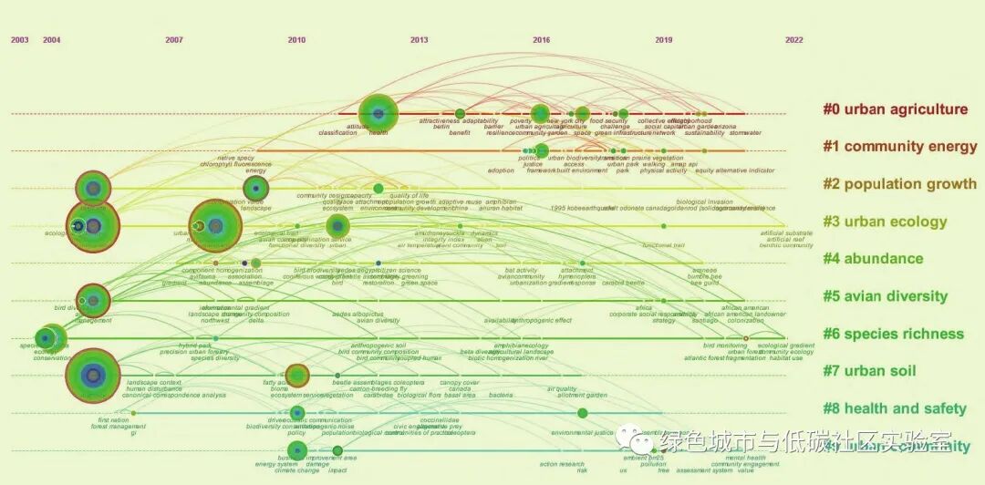 从图可以看出,国外社区研究的关键词前五依次为都市农业(urban agriculture) 、社区能源(community energy) 、人口增长(population growth)、丰富度(abundance) 、鸟类多样性(avian diversity),可反映出国内外研究的差异性。国外城市在再开发过程中,通过都市农业(表现形式包括社区花园及其他绿色基础设施)重视食物系统可持续性以及城市韧性规划发展与相关政策制定。另外,从生物多样性保护和资源效益衡量的角度出发剖析社区的能源供需平衡,探讨城市新陈代谢,同时展开对社区的经济社会系统和生态系统的研究。通过对关键词的突现度进行排序,国外学界由早期对社区生态(ecology)的研究逐渐过渡到如何应对气候变化(climate change)、构建绿色基础设施(green infrastructure) 以及评社区生态系统服务 (ecosystem service)。