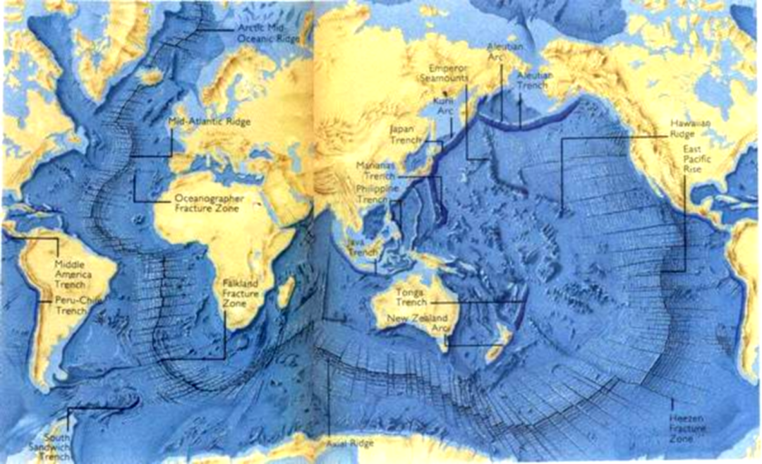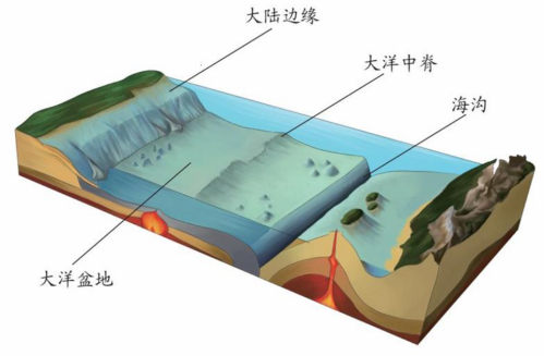 洋底地形大致可分为大洋中脊、大洋盆地和大陆边缘三个巨型单元。大洋中脊一般位于大洋中部;大洋盆地位于洋中脊与大陆边缘之间;大陆边缘是过渡地带。