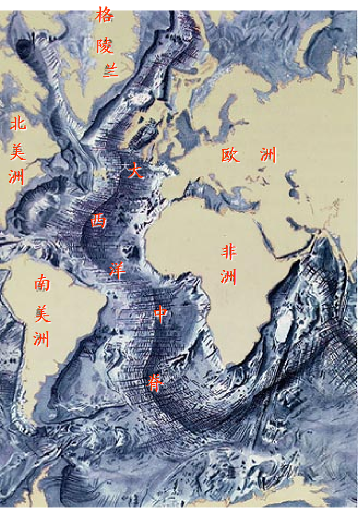 1 ~' n9 E4 ^3 _+ [# L( K 1925-1927年期间,德国“流星号”回声探测确定大西洋纵列着一条长达17000km的大洋中脊。1956年,美国学者尤因(M. Ewing)和希曾(B.C.Heezen)指出世界各大洋均有洋脊存在,这条洋底山系在太平洋、印度洋、大西洋、北冰洋内连续延伸,成为环球山系。   g) u# V# ]1 E