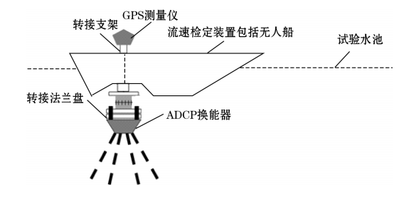 9 V0 a$ J9 [* n `& k4 Z1 D8 t% C 传统ADCP检测方法采用拖车作为载体,整体装置较为复杂且拖车速度受限。以无人船作为搭载试验仪器的载体,其速度能够达到最高3m/s,并且无人船体积较小、更加灵活自由,可按规定航线航行,较为理想。本文采用定制的自动无人船,船身采用高分子聚酯碳纤维材料减少磁性金属对检测设备的影响,并搭载绝对直线技术。校准系统通过转接法兰盘将被测ADCP换能器安装到无人船底部,且将ADCP通讯电缆接入船体电子水密舱。通过法兰盘转接的方式可以适配不同型号的ADCP。将GPS-RTK安装在无人船顶部,并尽量保证二者的轴线在同一直线上,如图1所示。以确保被测ADCP与GPS-RTK所测量的速度为船身相同位置速度值。