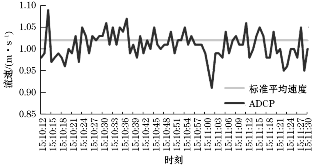 根据HY/T 102-2007《声学多普勒流速剖面仪检测方法》中所描述的数据处理方法,首先利用 准则剔除数据中的粗大误差,剩余101组数据,大于100组,符合要求。计算GPS-RTK测量序列的平均值 被测ADCP的测量序列的平均值 0.982m/s。