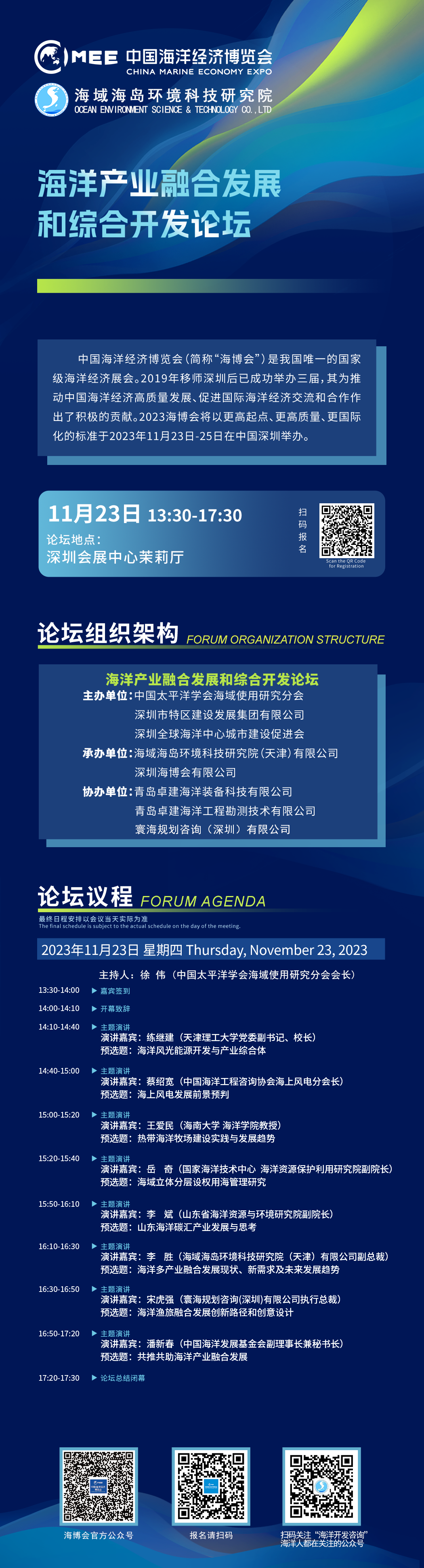 ! _( a2 t/ u$ U- g 论坛背景为全面落实党的二十大关于加快建设海洋强国重大部署,提高海域资源综合利用效率,促进海洋经济高质量发展,中国太平洋学会海域使用研究分会受2023中国海洋经济博览会组委会委托,特举办2023中国海洋经济博览会“海洋产业融合发展和综合开发”论坛,论坛定于2023年11月23日在深圳召开。论坛拟邀请国内海洋产业、海域资源管理等领域专家围绕海洋产业融合创新发展、海域立体使用等行业热点话题进行深入交流和探讨。1 I% _: L( P+ F0 k' y+ I$ G, @