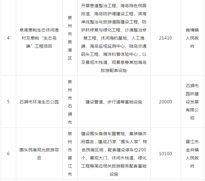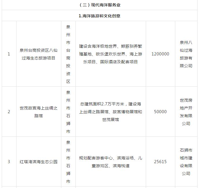 其中,泉州有28个项目列入今年的海洋强省在建重大项目,项目总投资682.92亿元;有11个项目被列入前期项目,项目估算总投资69.54亿元。泉州台商投资区八仙过海生态旅游项目名列其中,建设含海洋极地世界、鲸豚驯养繁殖基地、欧乐堡欢乐世界、海上游乐项目、国际酒店及配套项目。
