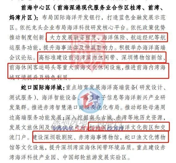 . U0 m0 D' p- r" w4 P1 A1 Z+ Q 前海-蛇口自贸区:加快制度创新,营造一流营商环境, 引领海洋现代服务业发展。深化蓝色金融开放创新,构建多元融资体系。加快发展高端航运服务及海事法律、仲裁服务。依托龙头企业发展海洋总部经济,培育发展海洋电子信息、海洋智能设备、海洋数字科技研发集群,提升海工装备产业能级。 发掘特色历史文化资源,大力发展邮轮经济及休闲文旅产业, 积极举办国际海洋会议论坛,打造海洋协作及文化交流门户。