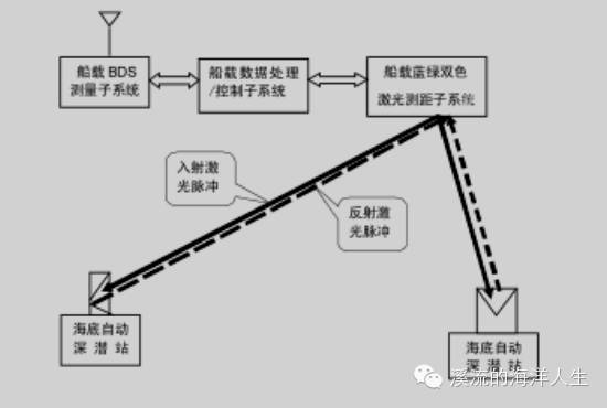 ; o4 J& X$ Z* O 但是,米级精度的海底大地测量控制点,不能满足海底地球动力学研究和灾害性海况信息探测的需要,必须将其提高一二个数量级。特别是同一个点位的重复测量精度,需要达到厘米级甚至更高的测量精度,才能准确地测得海底地壳动态参数,捕获灾害性的海况信息。这是当今海底大地测量的一个国际性难题。为了寻求海底点位的精确测量方法,笔者曾于1992年3月提出了用于海底定位的GPS/激光测距协同系统的概念设计。现将它更改为用于海底定位的船载DBDS/激光测距协同系统,亦是可行的。该系统包括以下4个子系统(见图2)。