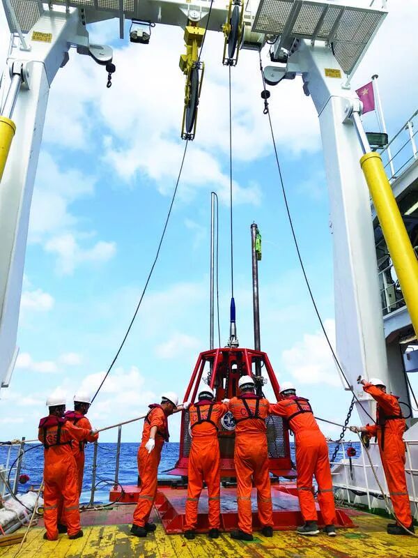8 |' }. Y3 N& V" F* F 4月2日8时15分。“海洋地质九号”船航行至某水深1800米海域,船速降至2节~3节,准备开展南海海试航次第二航段首个设备布放。