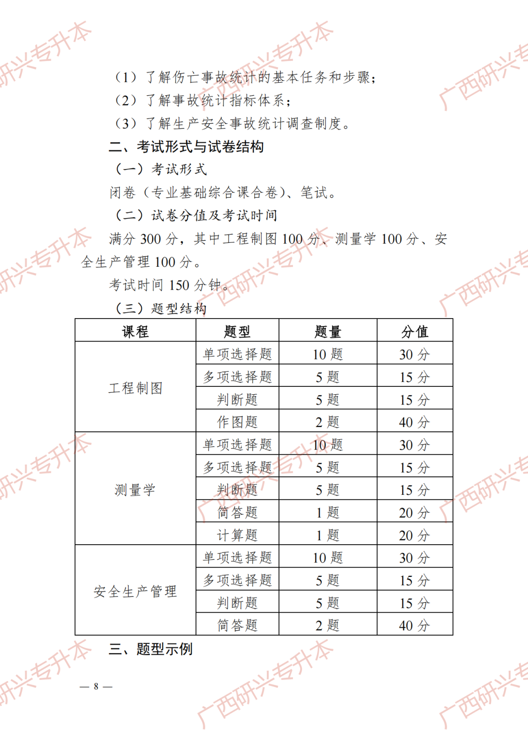 英语(150分,120分钟)+数学(150分,120分钟)+工程制图、测量学、安全生产管理(300分,150分钟)