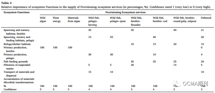 # \; J$ S+ a% _) U3 w 表4 生态系统功能在生态系统服务供给中的相对重要性(%)