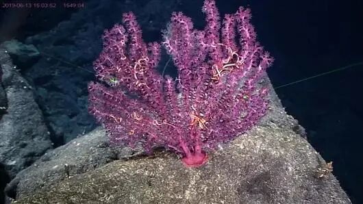 ) \6 `+ p% R. m( i: P0 c; o. n9 K 在此次发布的5个深海生物新物种中,海洋所紫柳珊瑚(新种)高约33厘米,呈扇状,亮紫色,隶属珊瑚纲、软珊瑚目、紫柳珊瑚科。 2019年发现于西太平洋卡罗琳海山1549米水深处。