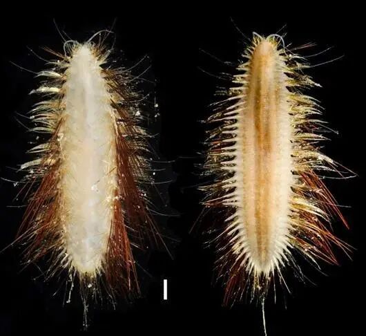 6 }9 f/ k% N* K, w0 O 海洋所镖毛鳞虫(新种)长6~7厘米,体覆闪亮的金色鱼叉状刚毛,隶属多毛纲、鳞沙蚕科、镖毛虫属。于2019年发现于卡罗琳海山888~980米的岩石底。