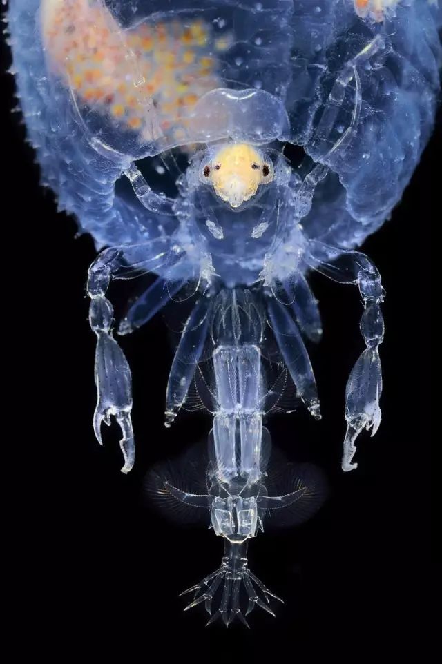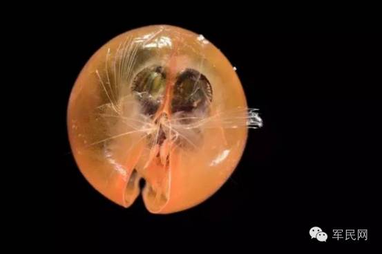 + i; _7 J# j5 U$ s2 P& W 拥有着食尸鬼一般外表的介形虫(ostracod,又名种虾),几千年来几乎一直以“一颗漂浮着的头颅”的面目示人。它们的身体几乎密不可分,头部和身体紧密地相连,和附肢一起,被一颗球状的外壳包裹着。这种相貌古怪的介虫类物种(Gigantocypris muelleri),拥有着如同反射镜一般的双眼,可以用来定位极其微小的浮游生物。