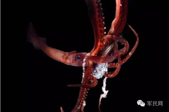 这绝非是一种友好的拥抱:元帅手乌贼(学名Chiroteuthis mega)会用它的触手缠住猎物。它们也拥有着能够产生光子的细胞,并引诱倒霉的鱼类接近,并最终被这些软体乌贼吞噬。 , P5 o+ o, h3 d2 j