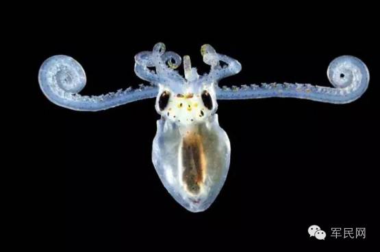 幼体时的深奇鱿(学名Bathothauma lyromma)用长杆和球茎一样的眼睛和两条短肢来搅浑水。和许多玻璃鱿鱼一样,该物种在身体的下表面长有可以发光的器官,用于欺骗捕食者,并掩藏它们那有着独特外形轮廓的眼睛。 1 I: X% p; x0 D