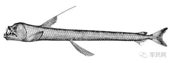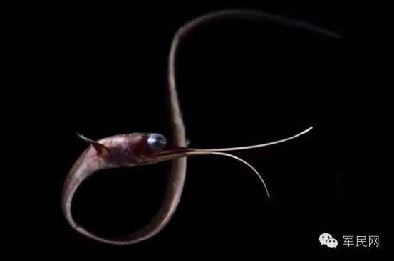 t4 r9 i6 x! \2 F/ A9 A5 f0 t- e% Y, R 提到鞭尾鱼(学名Stylephorus chordatus)最令人惊讶的特征,毫无疑问是它们那对绿色的、能够伸缩变形以捕捉任何一丝光线的眼睛。鞭尾鱼通过膨胀它们的口腔以产生负压,像吸气一样吸入毫无防备的猎物。尽管有着吸尘器一样的捕食习惯,这位Steylphorus属的唯一成员依然因为其鞭子一般延伸的尾部形状,而被命名为鞭尾鱼。 2 ]& w/ k- [) e6 b; G