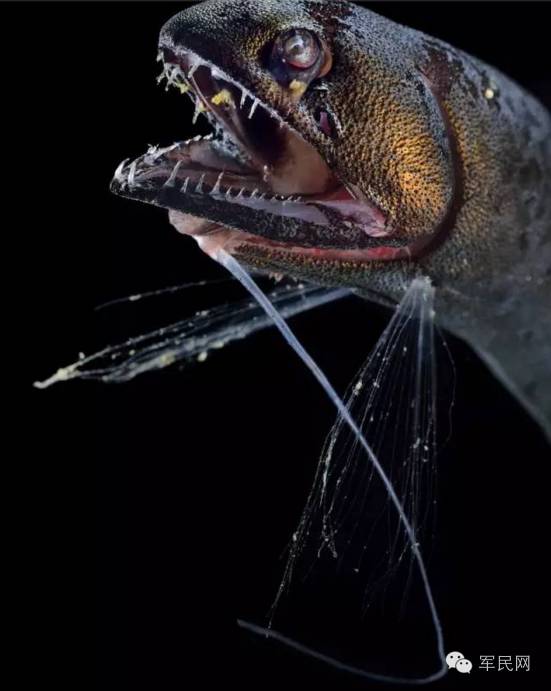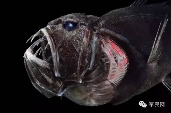 丝须深巨口龙鱼(学名Bathophilus nigerrimus)的下颌悬挂着一枚倒钩,可以配合尖牙捕捉包括甲壳类动物和小鱼之类的猎物。 尽管它们有着威胁的外表,但实际上这种龙鱼的下颚非常脆弱。确保猎物被尖牙成功穿刺,是它们能够成功吃上一顿大餐的关键。 : I! B. B( P/ I6 s' C