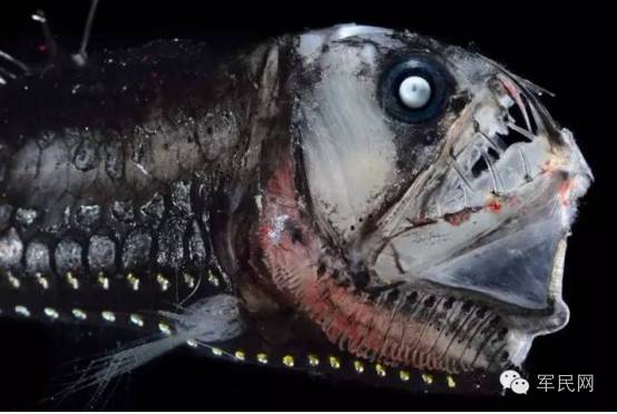 像许多其他深海鱼一样,斯隆氏蝰蛇鱼(学名Chauliodus sloani)使用能产生光电子的细胞,来引诱无知的猎物靠近它的大嘴。 一旦咬住受害者,蝰鱼那独特的,相互铰接着的利齿会向内旋转,让猎物无法逃脱,只能无可奈何地滚进捕食者的食道中。 & ?* T; B: D; t