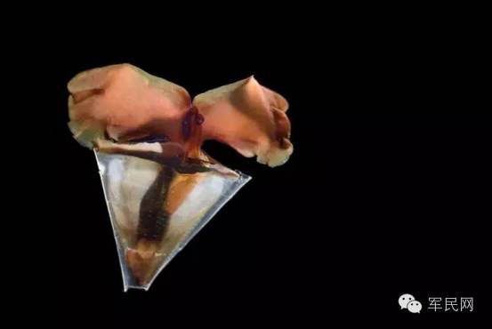 : _1 H- E- E+ [- L5 l8 F 正如名字所显示的一般,海蝴蝶(学名Clio chaptali)——海蜗牛家族一员——似乎能在水中飞行。 它们两扇肉质的“翅膀”,实际是由蜗牛的足演化而来。通过“翅膀”引起的震颤,海蝴蝶躲在半透明的壳内,就可以捕食被吸引而来的浮游生物。
