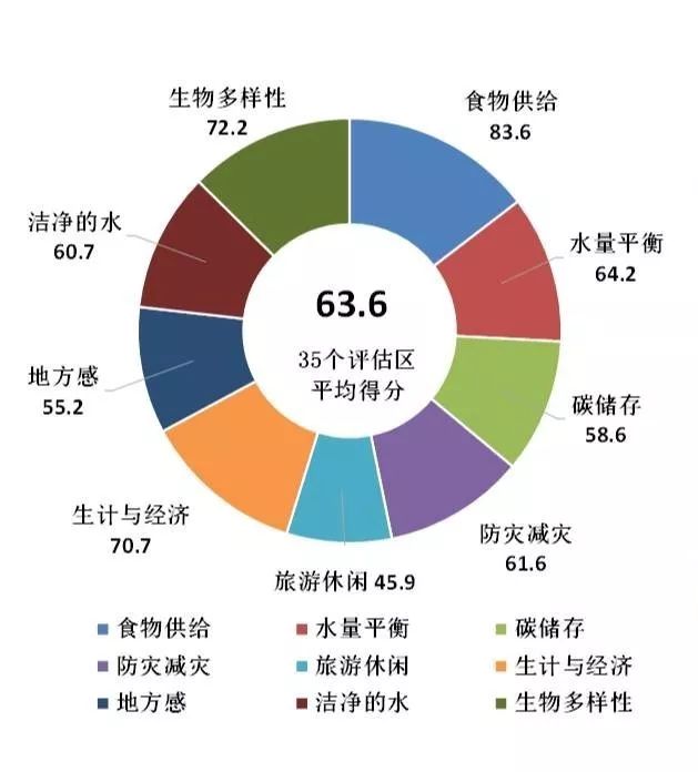 4 L' F, f& j, [* G: f; Z1 g) k* F! ~, u 从单项服务功能的评估结果来看,食物供给(83.6)、生物多样性(72.2)、生计与经济(70.7)、水量平衡(64.2)、消减灾害(61.6)和洁净的水(60.7)六项功能得分相对较高,这意味着,这些区域具有丰富的物种资源和良好的栖息环境,生物资源对当地居民生计起到了较好的基础性支撑作用。同时,在这些区域,湿地处于严格的保护状态,湿地保护率、水量和水质状况相对较好,在抵御灾害和水质调节方面对周围环境能起到到积极作用。然而,碳储存(58.6)、地方感(55.2)和旅游休闲(45.8)3项功能的得分均低于60分,这意味着湿地仍在多个方面受到人类活动的威胁。相较于其他地区,我国沿海湿地的保护状况并不理想。