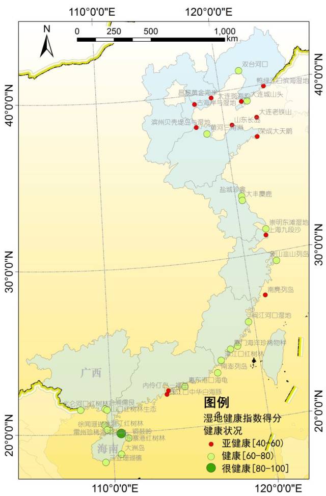 对沿海11省(直辖市、自治区)及35个国家级湿地自然保护区的湿地健康指数进行评估