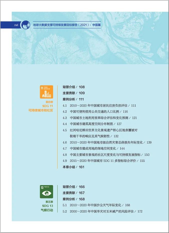 在SDG 11 可持续城市和社区方面, 本报告聚焦居民住房(SDG 11.1.1)、公共交通(SDG 11.2.1)、土地利用效率(SDG 11.3.1)、世界遗产保护(SDG 11.4.1)、城市灾害(SDG11.5.1/11.5.2)、开放公共空间(SDG 11.7.1)六个具体目标开展了基于地球大数据技术的指标监测与评估,并在中国省市级尺度开展了多指标综合评估。形成了分性别、分年龄段的中国人口高精度千米网格数据,生成了2020 年中国31 个省会城市及直辖市的城市建筑高度分布产品、中国地市级自然灾害总体损失年际变化数据集、中国城市建成用地绿地空间组分数据产品、中国社区尺度城市景观数据产品。基于以上数据,得出了2020 年中国城市建成区可便利使用公共交通的人口比例平均为90.15%,与2018 年相比上升9.59 个百分点;在不同发展情景下,未来10 年中国县级市及以上城市LCRPGR 指标均呈现下降趋势,到2030 年有望接近理想值1;中国自然灾害影响总体呈现减轻趋势,综合防灾减灾能力和城市抵御自然灾害的设防能力得到明显提升;2000 年以来中国93 个典型城市建成用地的绿地空间显著上升,城市生态绿化成效显著;2020 年各市级行政区可持续性表现较好等关键结论。上述研究成果可为中国SDG 11 的实现提供数据和决策支撑,也可以为其他国家提供示范和参考。