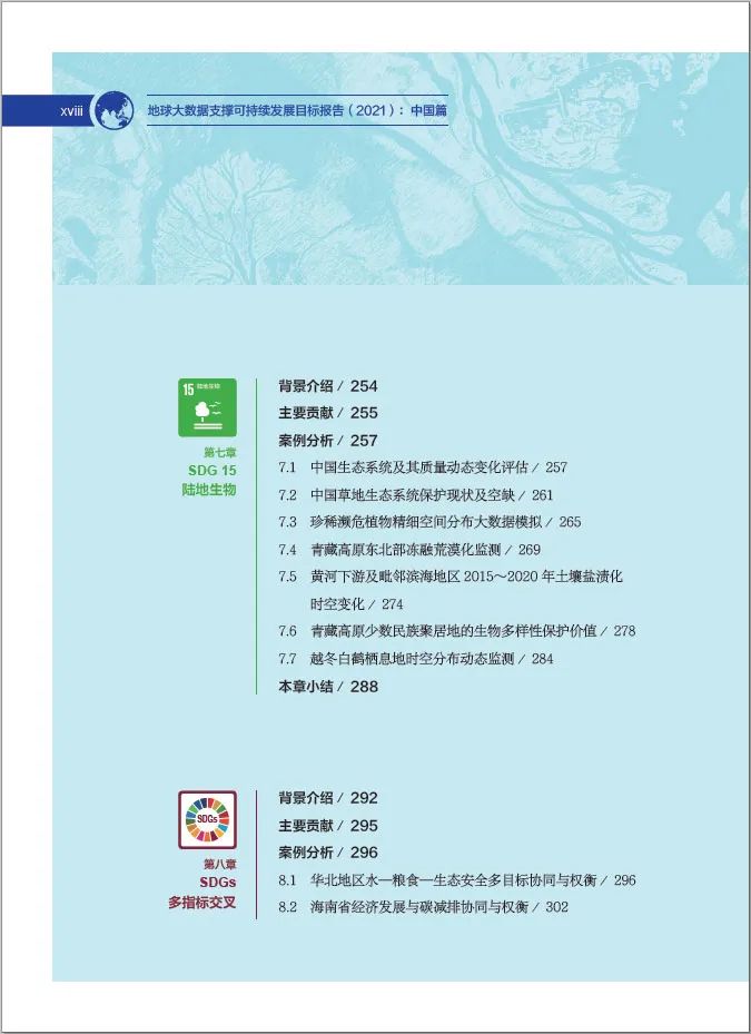 & x- {3 d) A6 n7 b6 X 《地球大数据支撑可持续发展目标报告(2021):中国篇》聚焦零饥饿(SDG 2)、清洁饮水和卫生设施(SDG 6)、可持续城市和社区(SDG11)、气候行动(SDG 13)、水下生物(SDG14)和陆地生物(SDG 15)六大可持续发展目标(SDGs),专注于新方法新指标的探索、可持续发展进程的跟踪评估,以及多指标交叉研究的理论与实践,针对27 个具体目标汇集了52 个典型案例,展示了在典型地区和中国两个尺度上针对SDGs指标的研究、监测和评估成果,包括36 套数据产品、25 种方法模型和41 个决策支持。这些研究成果展示了中国利用科技创新推动落实联合国“2030 年可持续发展议程”的探索和实践,充分揭示了地球大数据技术对监测评估可持续发展目标的应用价值和广阔前景,开拓了在联合国技术促进机制框架下利用大数据、人工智能等先进技术方法支撑联合国“2030年可持续发展议程”落实的新途径和新方法,可为各国加强该议程的落实监测评估提供借鉴。
