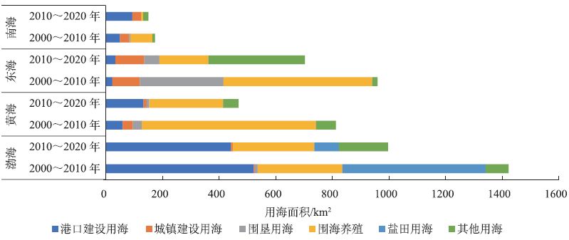 " A) B! S" h; n5 x% D: `# N- g0 G ▲ 2000~2020 年中国各海域沿岸新增围填海面积变化