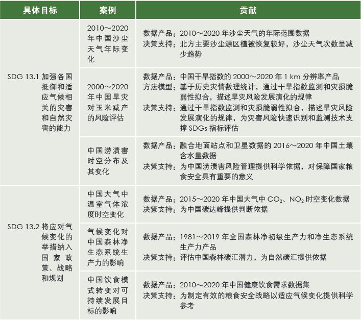 r' {3 D# U4 V# E 在SDG 13 气候行动方面,本报告聚焦抵御气候相关灾害(SDG 13.1)和应对气候变化举措(SDG 13.2)两个具体目标,通过地球大数据方法生产了中国沙尘天气年际影响范围数据集、土壤含水量数据集、干旱指数数据集、中国CO₂ 和NO₂ 浓度数据集、中国森林净生态系统生产力数据集以及健康饮食需求数据集。依据这些具有时空特征的系列数据集发现,近10 年中国北方春季沙尘天气频次波动下降;近20 年北方气象干旱波动较大且有加重趋势,但由此造成玉米的减产率较为平稳;2020 年涝渍害受灾面积相对于其他年份增加明显;全国CO₂ 平均浓度仍在增加,但增幅减小;受新冠肺炎疫情带来的经济活动波动影响,全国NO₂ 平均浓度于2020 年2 月达到波谷,12 月快速达到波峰且超过以往年份;净生态系统生产力分析显示,森林面积增加对中国碳汇的增加具有重要贡献,近十年来中国年均森林碳汇增加速度为199.54 TgC;采用合理的饮食模式,可以在温室气体排放和粮食安全之间取得更好的平衡等。通过以上数据和分析,可为应对气候变化相关灾害和长期影响,以及碳中和战略实施提供科学依据。 5 n, q. f+ k7 E. _ ^& m7 d8 {+ k