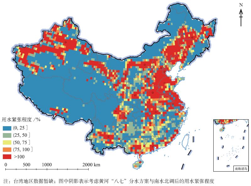 ▲ 自产水资源条件下中国用水紧张程度空间分布(栅格尺度)